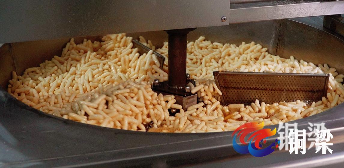 4月27日上午,銅梁城區裱褙街一個車間里,銅梁區級非物質文化遺產蘭花根代表性傳承人、銅梁軍辰食品有限公司負責人龍中德正在查看剛出鍋的蘭花根的質量。